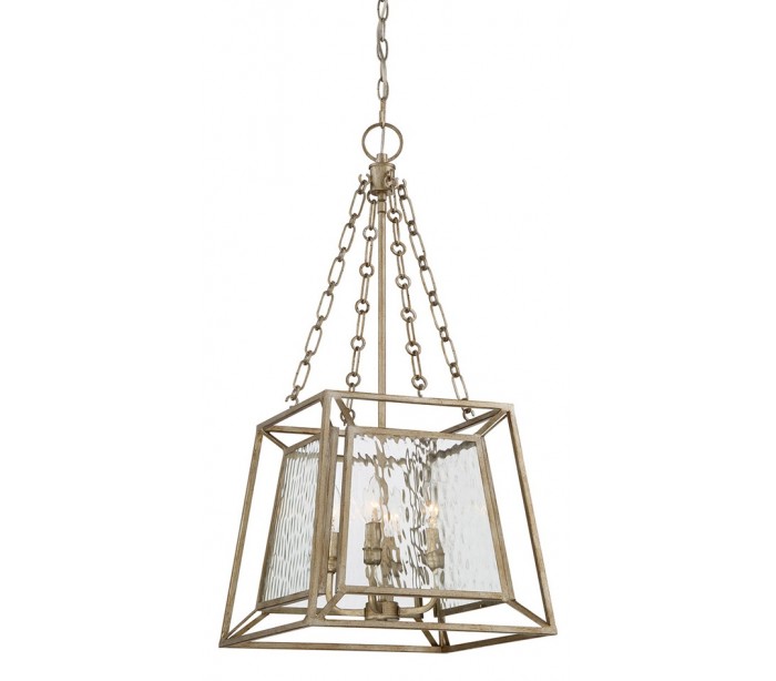 Lakeside lysekrone i et amerikansk design fra Quoizel. Lampen måler 38,1 cm i diameter og leveres til europæisk standard til 4 x E14 lyskilder. Lampen er udført i vintage guldlakeret metal og med detaljer i glas.