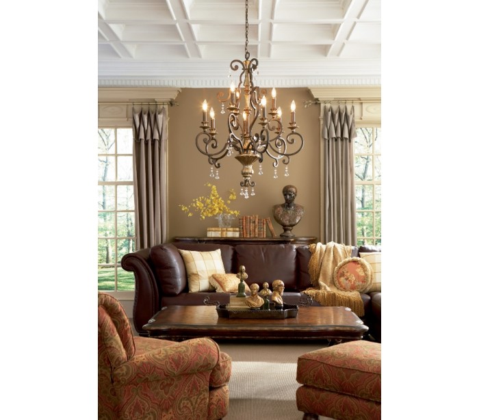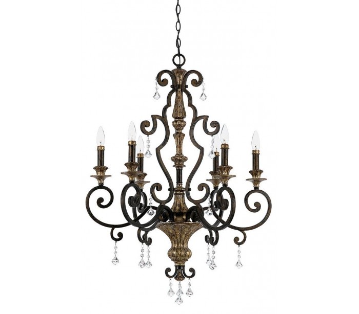 Marquette lysekrone i et amerikansk design fra Quoizel. Lampen måler 71,1 cm i diameter og leveres til europæisk standard til 6 x E14 lyskilder. Lampen er udført i mørk bronzelakeret stål med detaljer i antik guldlakering og glasprismer.