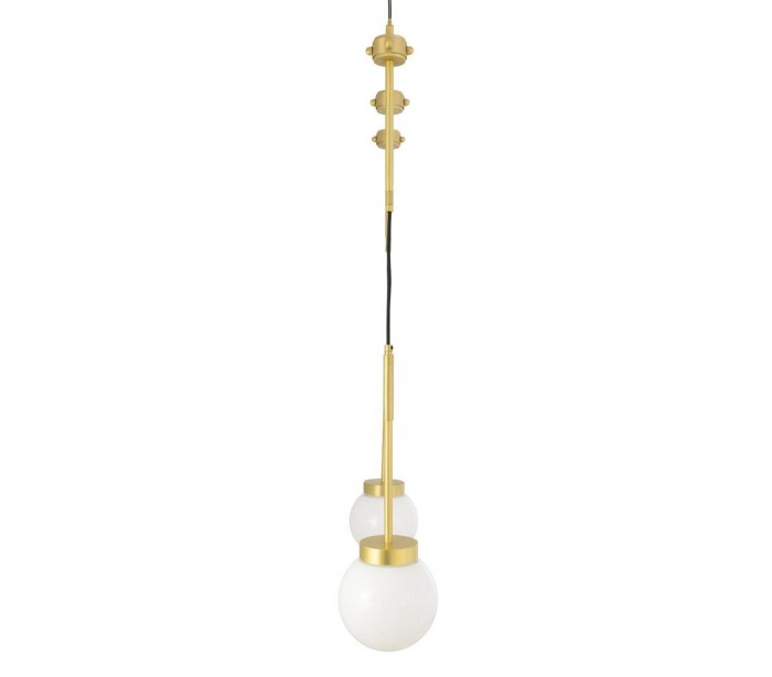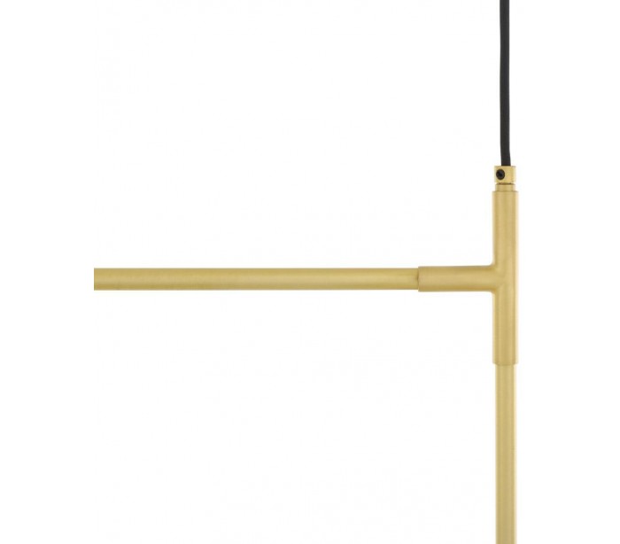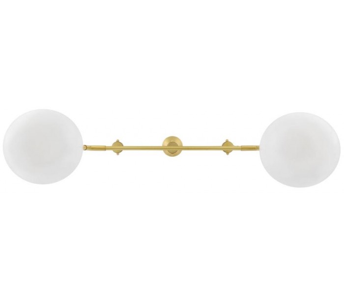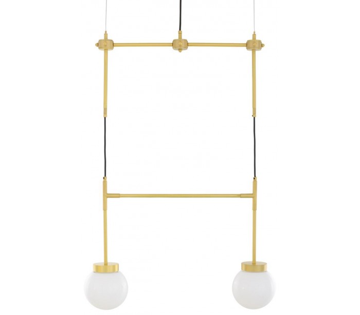 Davis lysekrone fremstillet i et moderne design i satineret messing og med skærme i hvid glas. Lampen måler 65 cm i bredden og anvender 2 x E27 lyskilder (Ekskl.).