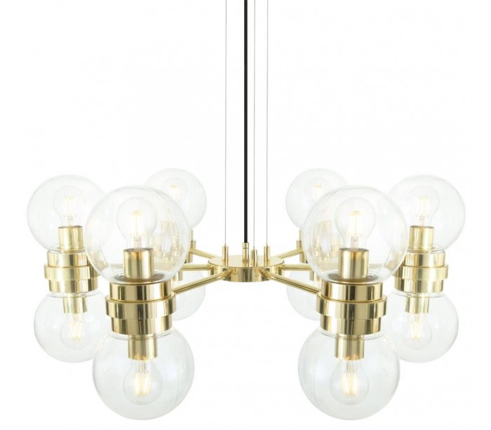 Eske lysekrone fremstillet i et moderne design i poleret messing og med skærme i klart glas. Lampen måler 80 cm i diameter og anvender 12 x E27 lyskilder (Ekskl.).