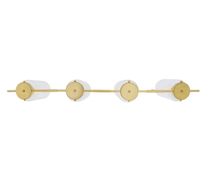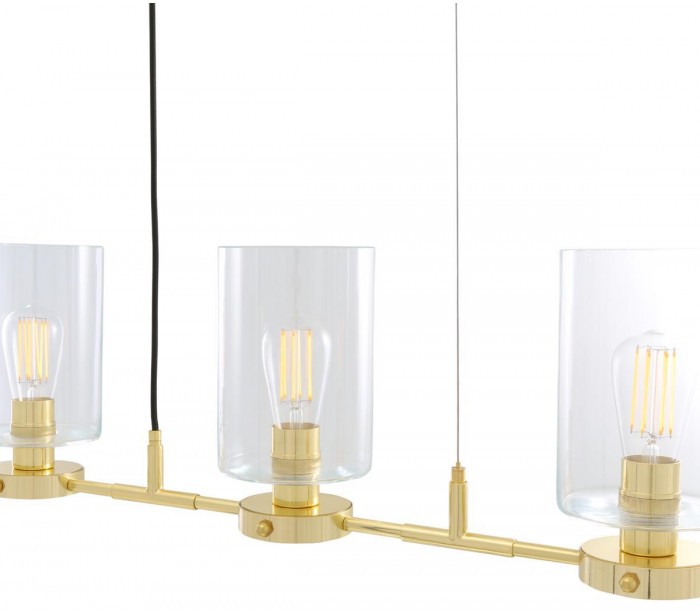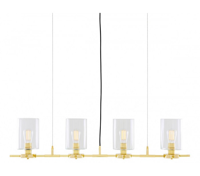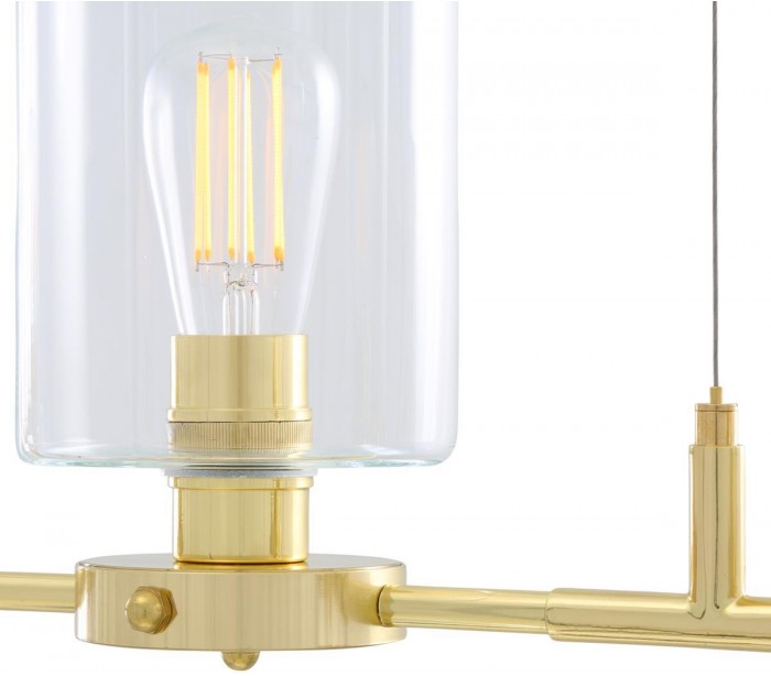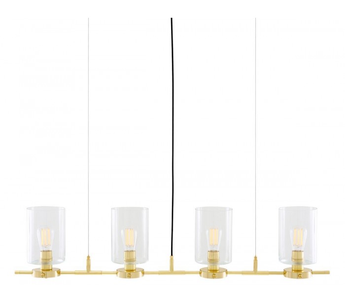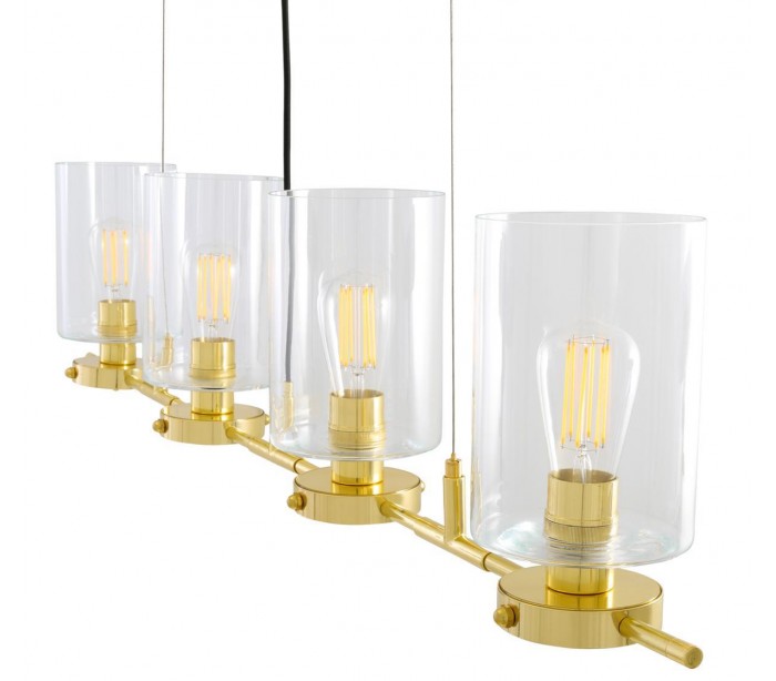 Lisselton lysekrone fremstillet i et moderne design i poleret messing og med skærme i klart glas. Lampen måler 120 cm i bredden og anvender 4 x E27 lyskilder (Ekskl.).