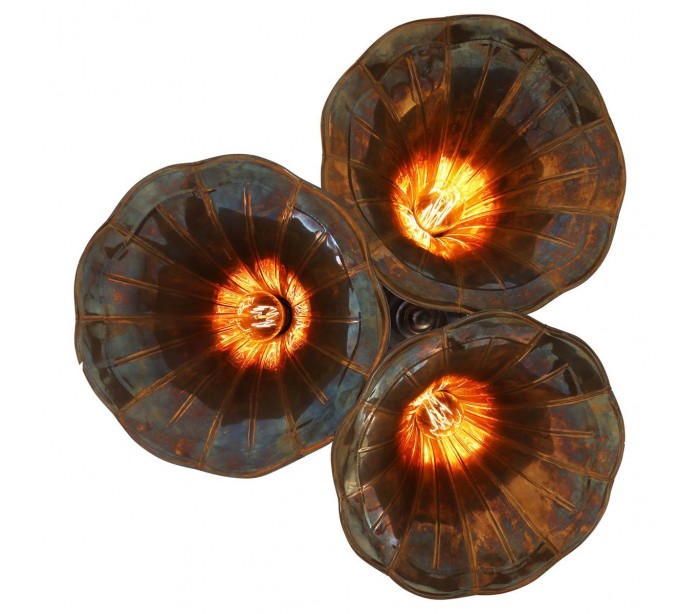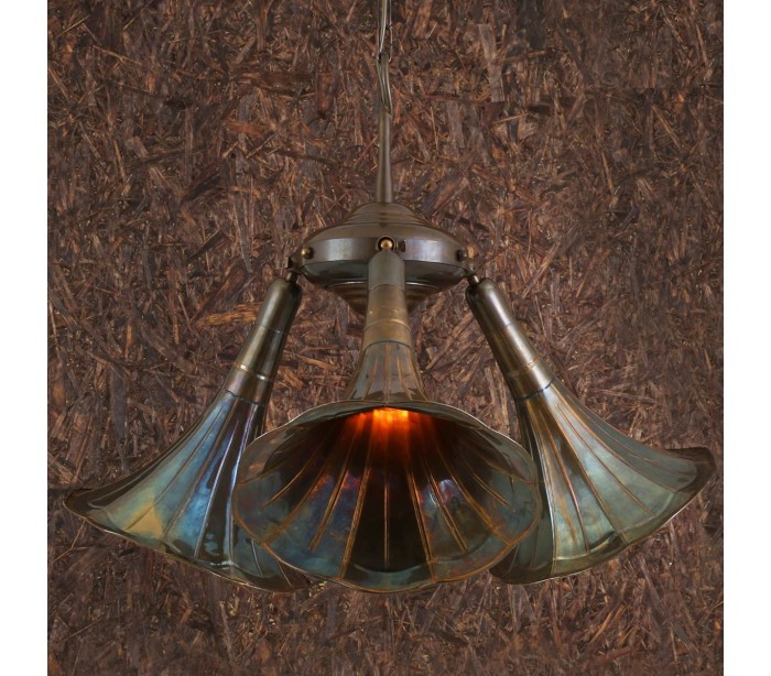 Grammophone lysekrone fremstillet i et industrielt design i antik messing. Lampen måler via justerbare lampearme 66 - 100 cm i diameter og anvender 3 x E27 lyskilder (Ekskl.).