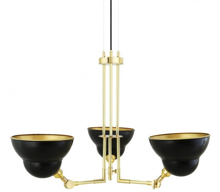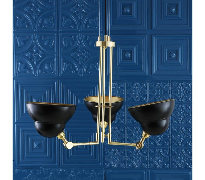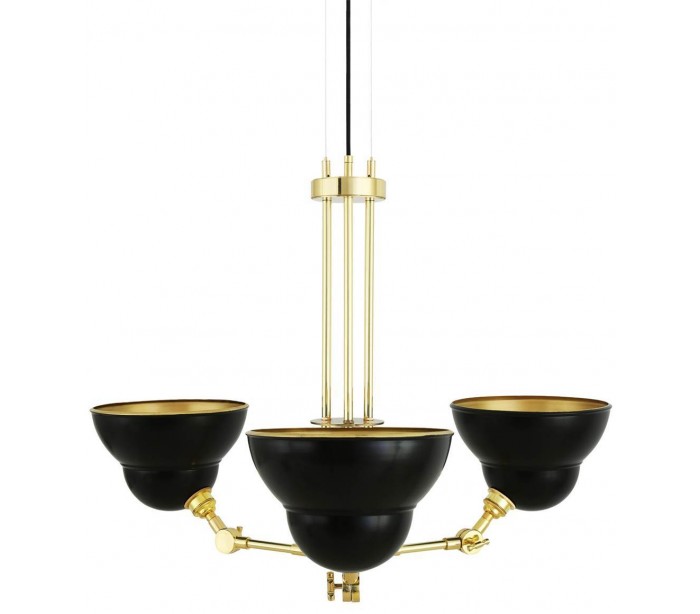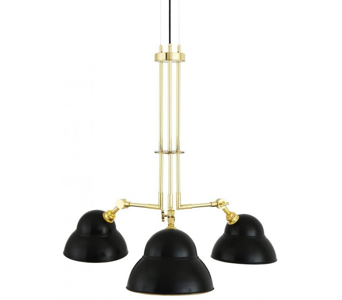 Argrinio lysekrone fremstillet i et industrielt design i poleret messing og med skærme i sortlakeret messing. Lampen måler via justerbare lampearme 50 - 100 cm i diameter og anvender 3 x E27 lyskilder (Ekskl.).