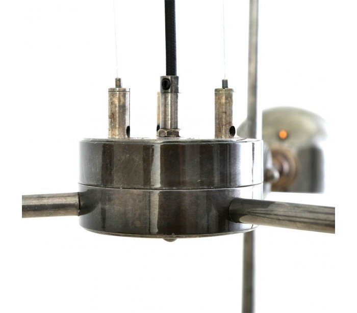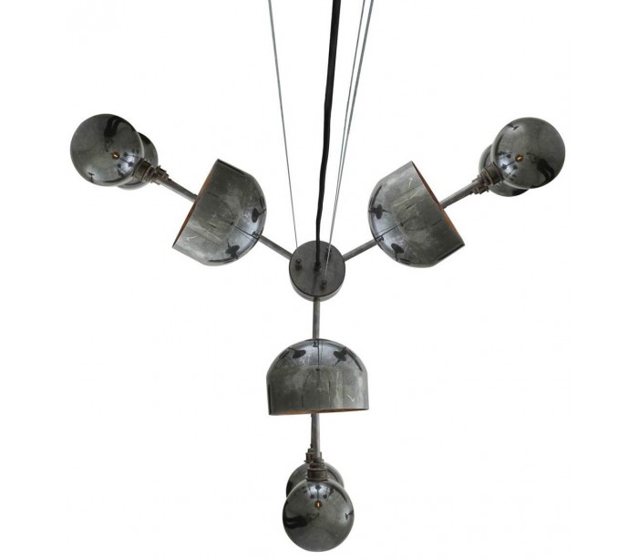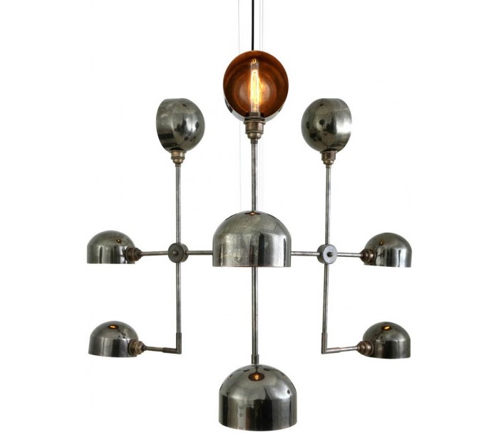 Comala lysekrone fremstillet i et industrielt design i antik sølvlakeret messing. Lampen måler 92 x 80 cm i diameter og anvender 9 x E27 lyskilder (Ekskl.).