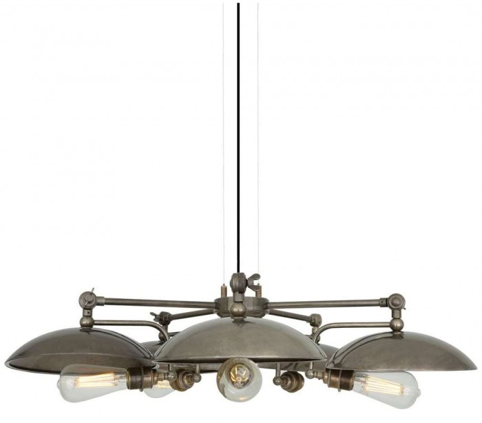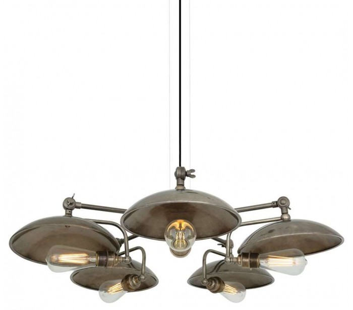 Cullen lysekrone fremstillet i et industrielt design i antik sølvlakeret messing. Lampen måler via justerbare lampearme 81 - 88 cm i diameter og anvender 5 x E27 lyskilder (Ekskl.).