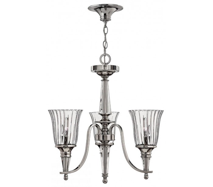Chandon lysekrone i et amerikansk design fra Hinkley. Lampen måler 53,3 cm i diameter og leveres til europæisk standard til 3 x E14 lyskilder. Lampen er udført i et design af sølvlakeret stål og med skærme i krystalglas.