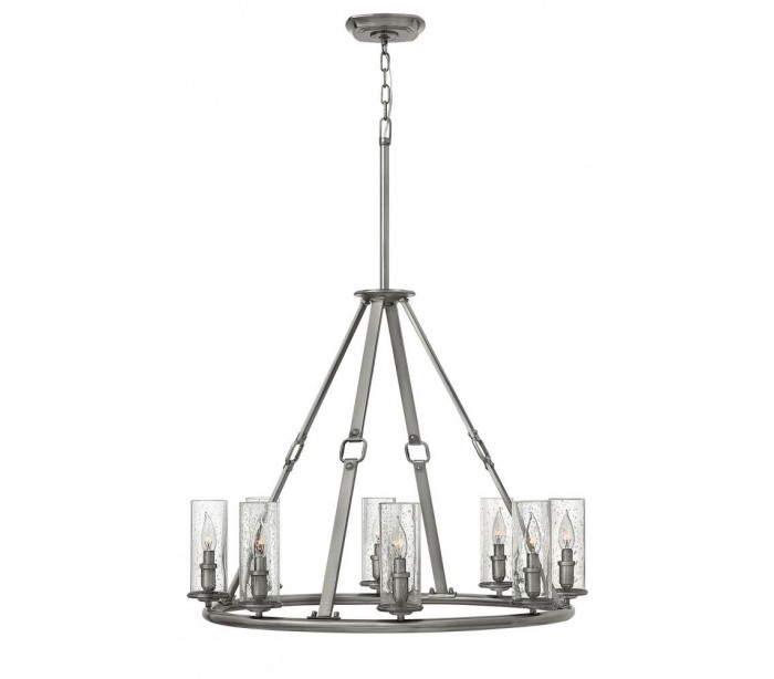 Dakota lysekrone i et amerikansk design fra Hinkley. Lampen måler 78 cm i diameter og leveres til europæisk standard til 8 x E14 lyskilder. Lampen er udført i et design af poleret antik nikkellakeret stål og skærme i regndråbe glas.