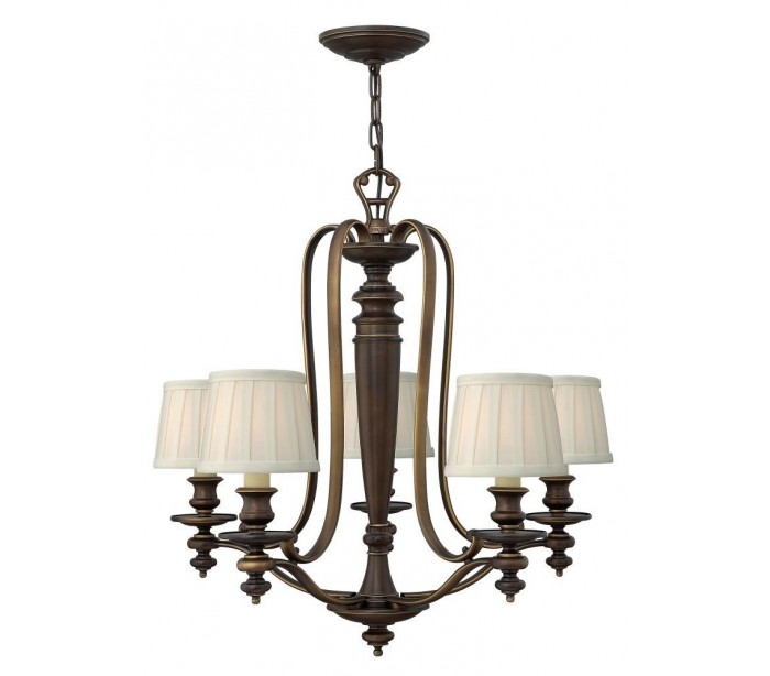 Dunhill lysekrone i et amerikansk design fra Hinkley. Lampen måler 69,2 cm i diameter og leveres til europæisk standard til 5 x E14 lyskilder. Lampen er udført i et design af antik bronzelakeret stål og med skærme i beige tekstil.