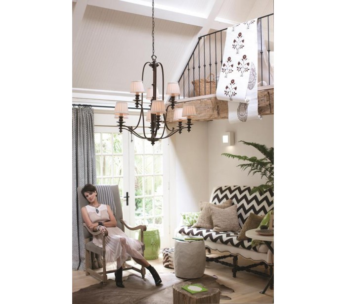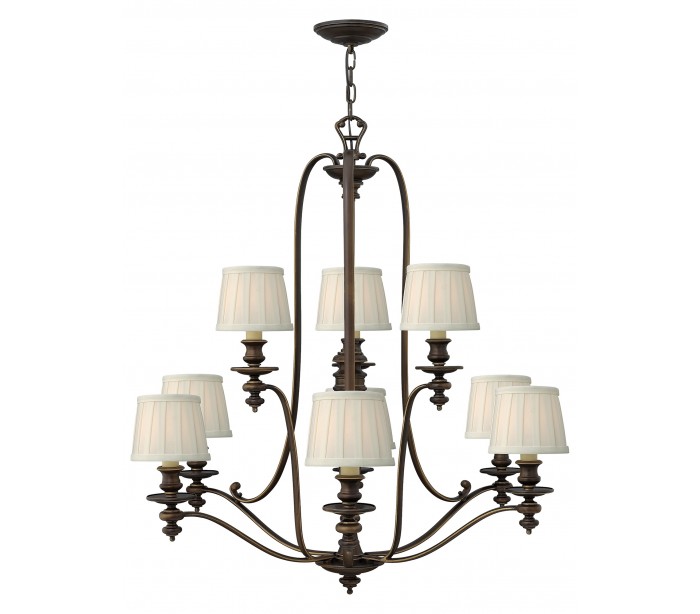 Dunhill lysekrone i et amerikansk design fra Hinkley. Lampen måler 94 cm i diameter og leveres til europæisk standard til 9 x E14 lyskilder. Lampen er udført i et design af antik bronzelakeret stål og med skærme i beige tekstil.