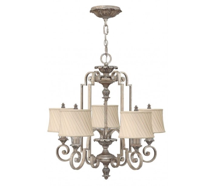 Kingsley lysekrone i et amerikansk design fra Hinkley. Lampen måler 66 cm i diameter og leveres til europæisk standard til 5 x E14 lyskilder. Lampen er udført i et design af antik sølvlakeret stål og med skærme i beige tekstil.
