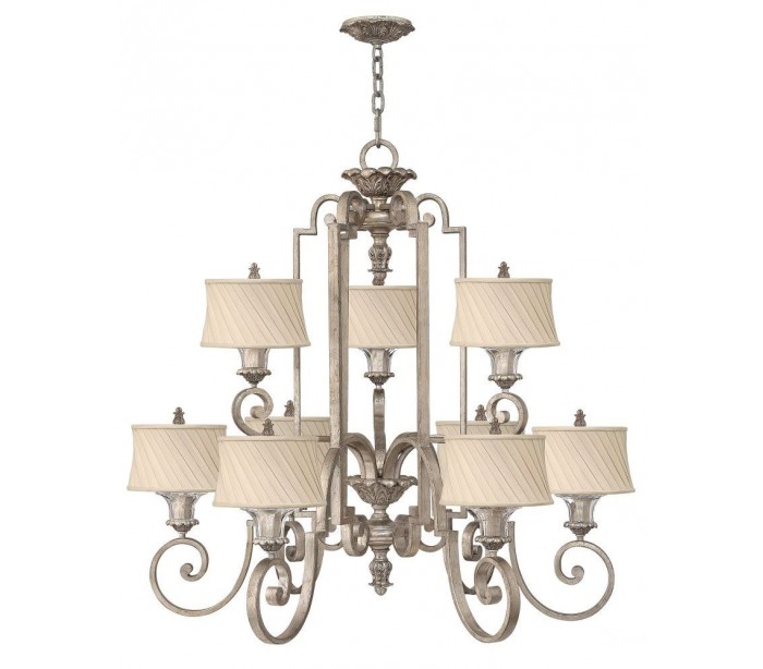 Kingsley lysekrone i et amerikansk design fra Hinkley. Lampen måler 114,3 cm i diameter og leveres til europæisk standard til 9 x E14 lyskilder. Lampen er udført i et design af antik sølvlakeret stål og med skærme i beige tekstil.