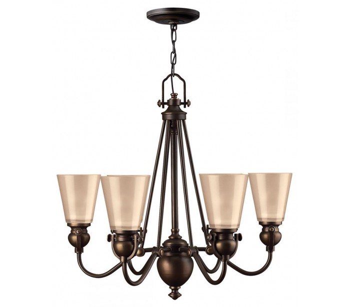 Mayflower lysekrone i et amerikansk design fra Hinkley. Lampen måler 66 cm i diameter og leveres til europæisk standard til 6 x E27 lyskilder. Lampen er udført i et design af aldret bronzelakeret stål og med skærm i ravfarvet glas.