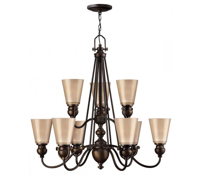 Mayflower lysekrone i et amerikansk design fra Hinkley. Lampen måler 81,3 cm i diameter og leveres til europæisk standard til 9 x E27 lyskilder. Lampen er udført i et design af aldret bronzelakeret stål og med skærm i ravfarvet glas.