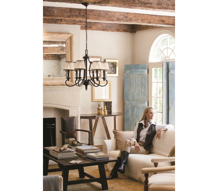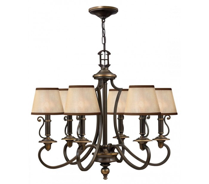 Plymouth lysekrone i et amerikansk design fra Hinkley. Lampen måler 70,5 cm i diameter og leveres til europæisk standard til 6 x E14 lyskilder. Lampen er udført i et design af aldret bronzelakeret stål og med skærme i ravfarvet organza.