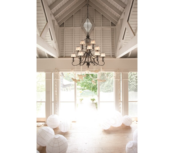 Plymouth lysekrone i et amerikansk design fra Hinkley. Lampen måler 113 cm i diameter og leveres til europæisk standard til 15 x E14 lyskilder. Lampen er udført i et design af aldret bronzelakeret stål og med skærme i ravfarvet organza.
