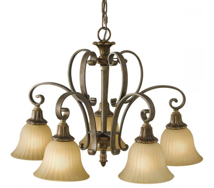 Kelham Hall lysekrone i et rustikt design fra amerikanske Feiss. Lampen leveres til europæisk standard til 5 x E14 lyskilder og måler 67,3 cm i diameter.