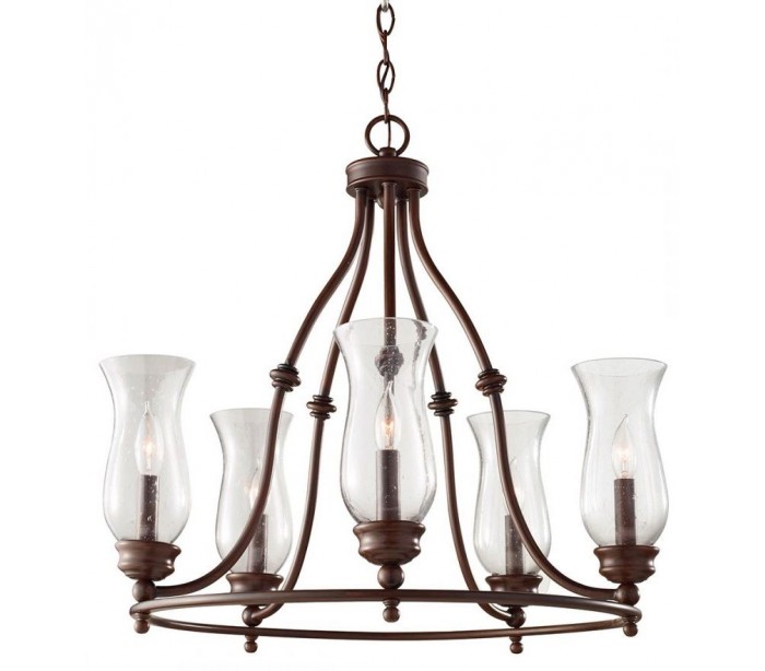 Pickering Lane lysekrone i et rustikt design fra amerikanske Feiss. Lampen leveres til europæisk standard til 5 x E14 lyskilder og måler 61 cm i diameter.