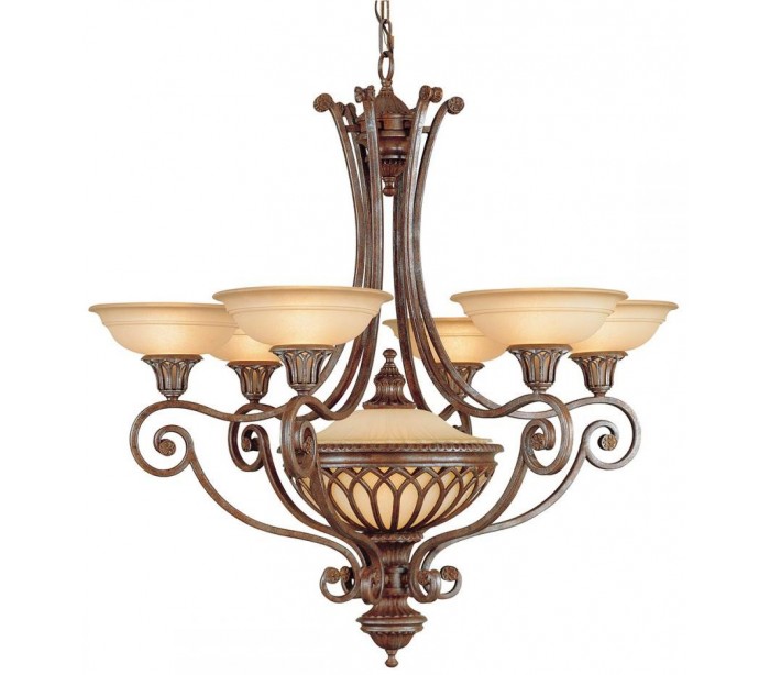 Stirling Castle lysekrone i et rustikt design fra amerikanske Feiss. Lampen leveres til europæisk standard til 7 x E27 lyskilder og måler 91,4 cm i diameter.