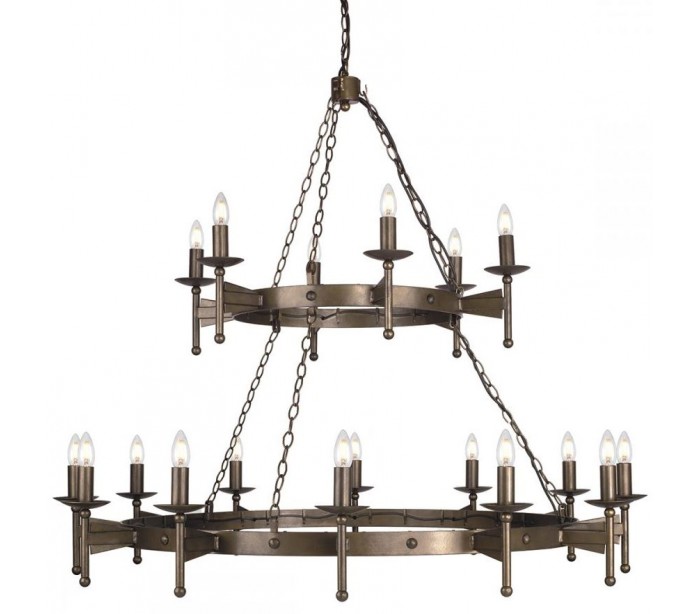 Cromwell lysekrone i et rustikt design fra britiske Elstead. Lampen leveres til europæisk standard til 18 x E14 lyskilder og måler 130 cm i diameter.