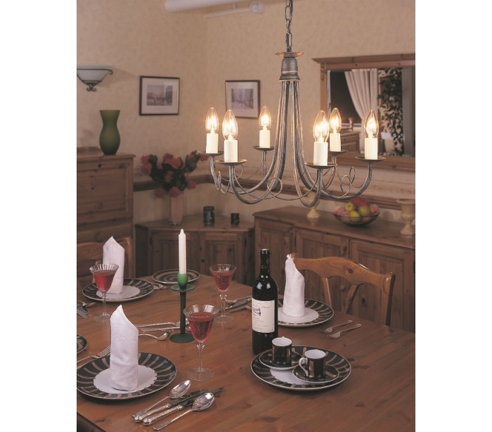 Minster lysekrone i et rustikt design fra britiske Elstead. Lampen leveres til europæisk standard til 6 x E14 lyskilder og måler 48 cm i diameter.