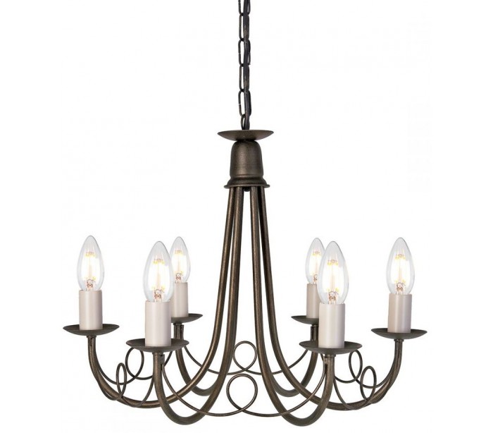 Minster lysekrone i et rustikt design fra britiske Elstead. Lampen leveres til europæisk standard til 6 x E14 lyskilder og måler 48 cm i diameter.