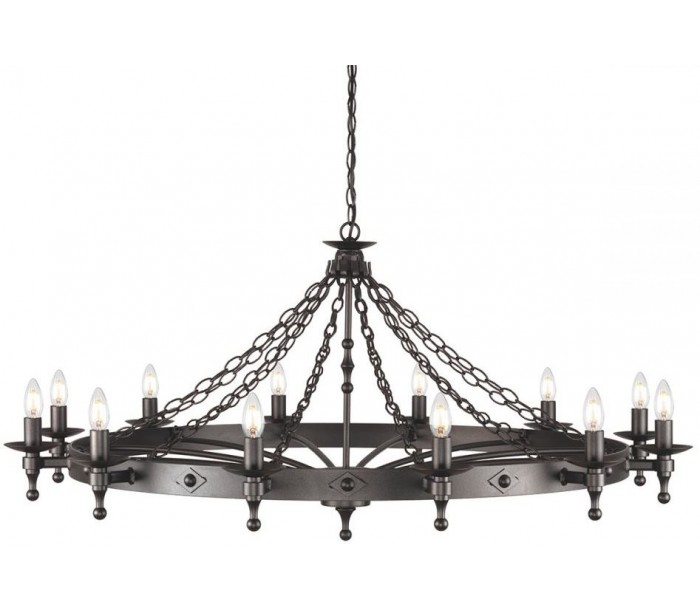 Warwick lysekrone i et rustikt design fra britiske Elstead. Lampen leveres til europæisk standard til 12 x E14 lyskilder og måler 122 cm i diameter.