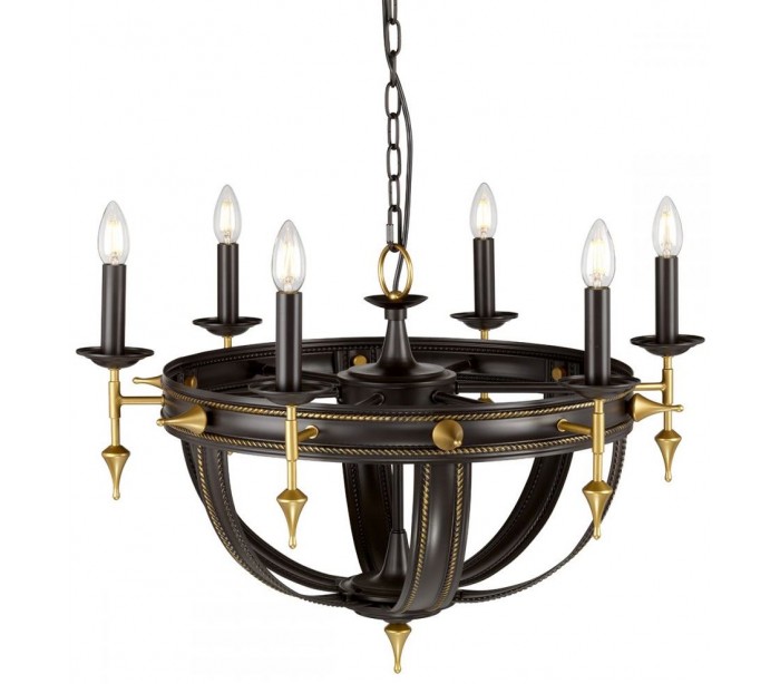 Regal lysekrone i et rustikt design fra britiske Elstead. Lampen leveres til europæisk standard til 6 x E14 lyskilder og måler 71,2 cm i diameter. Lysekronen er fremstillet i rustik bronzelakeret stål og med detaljer i guldlakeret stål.