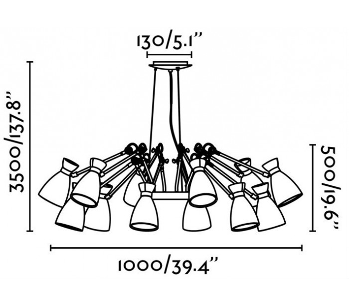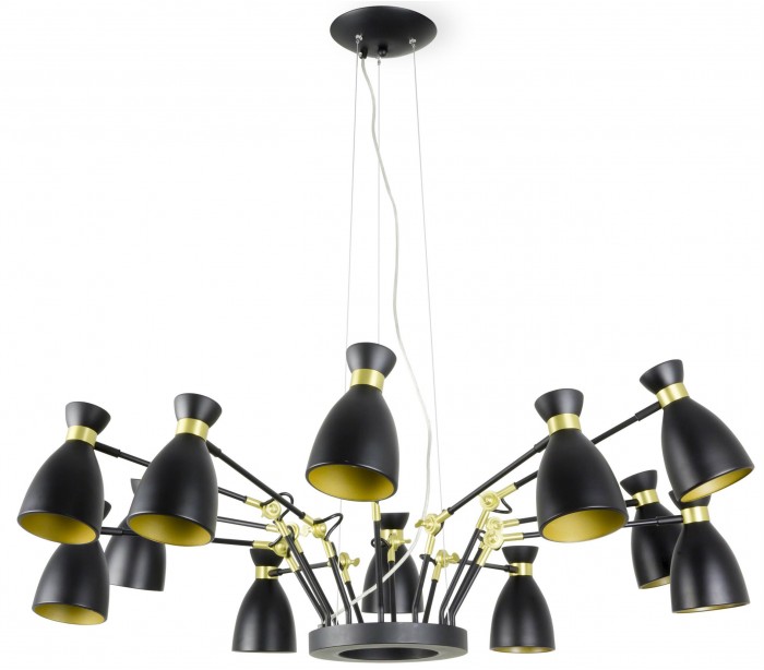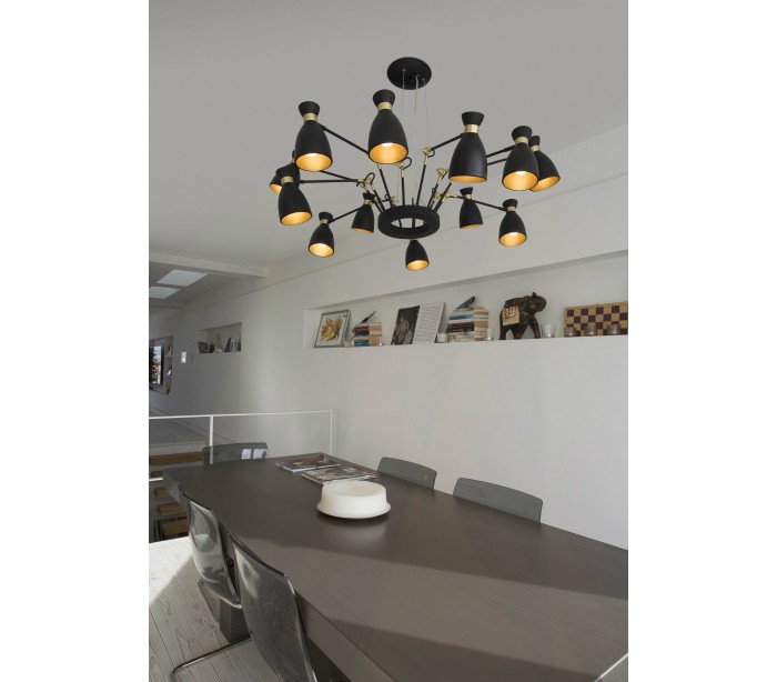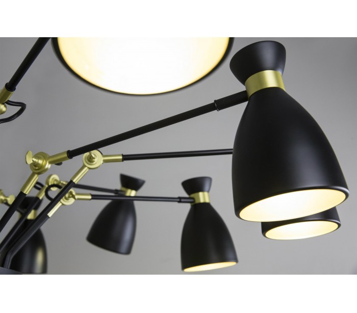 Lysekrone i et retro design, fremstillet i sort og satineret guldlakeret metal og med 12 lampeskærme der kan justeres i ønsket retning. Lampen måler 100 cm i diameter og anvender 12 x E14 lyskilder på max. 20W (Ekskl.).