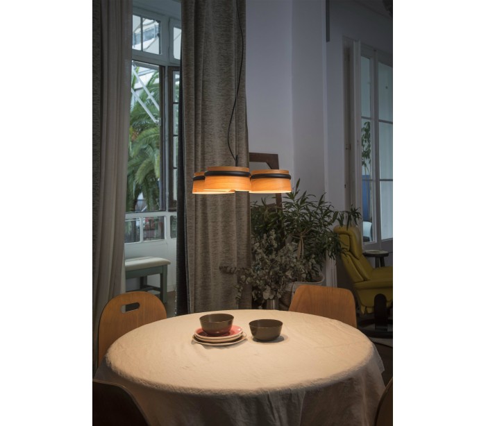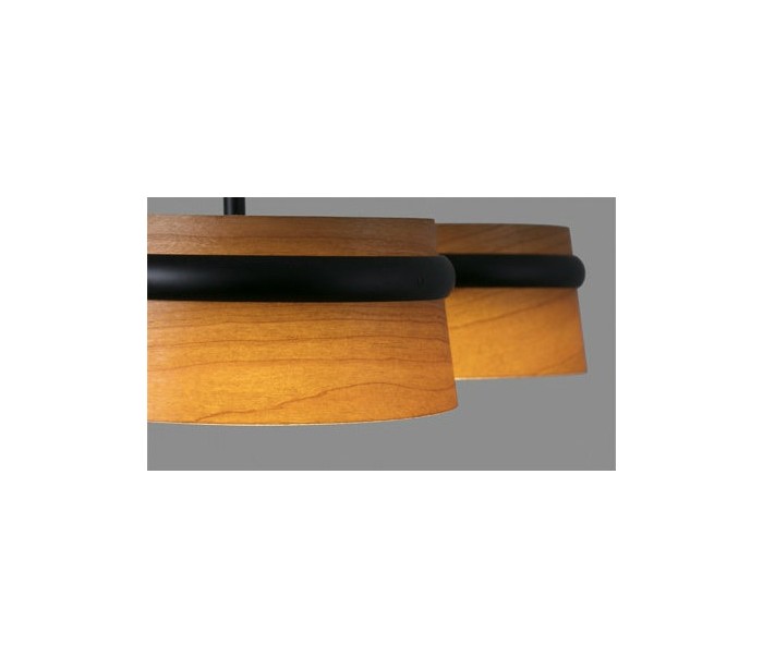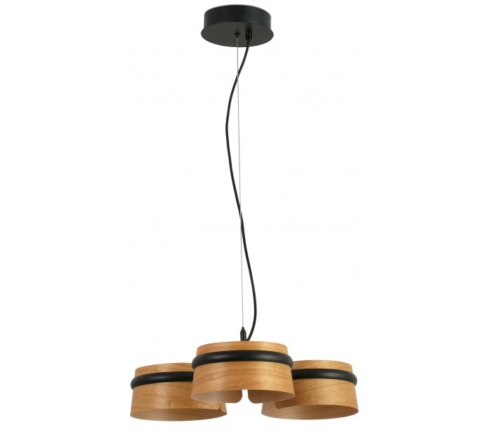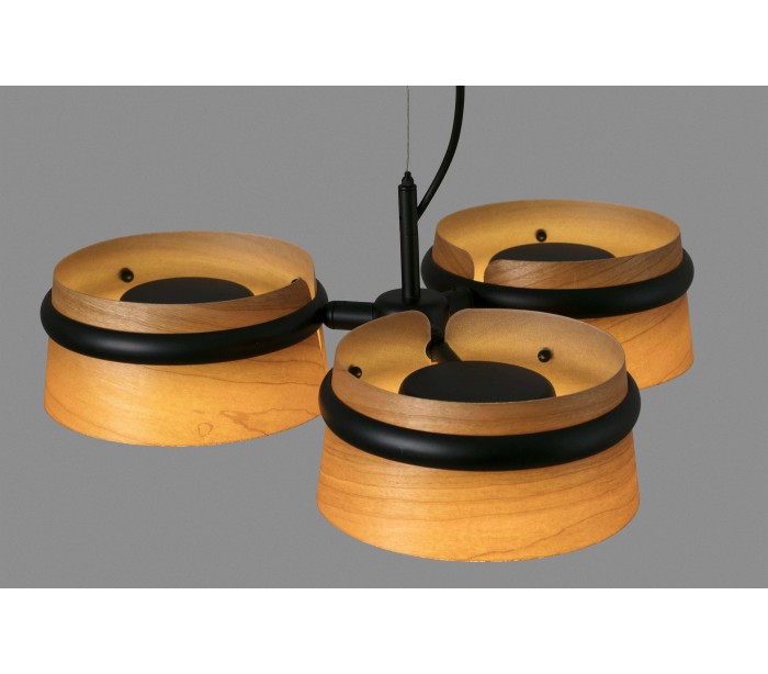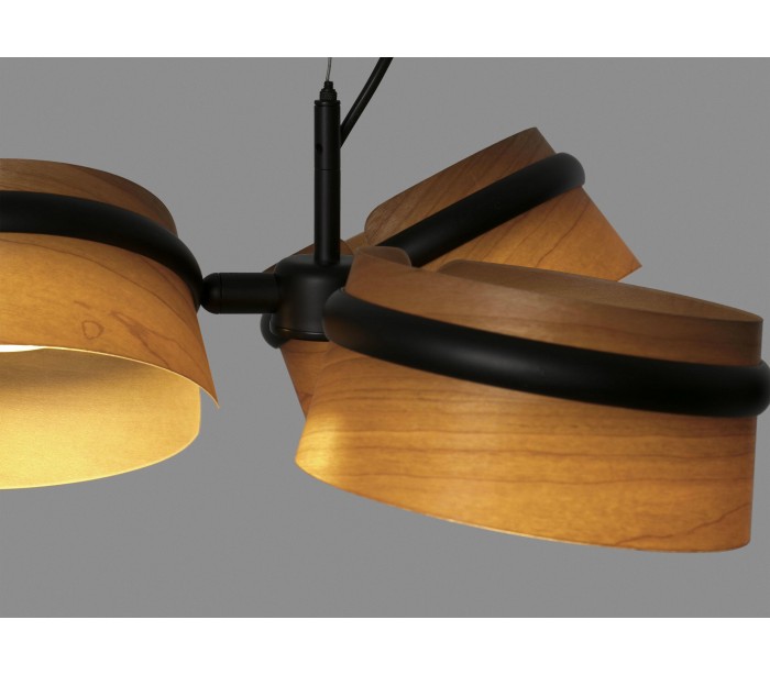 Lysekrone i et moderne design, fremstillet i sortlakeret metal og med skærme i træfinér. Lampen måler 52 cm i diameter og anvender 3 x SMD LED lyskilder hver på 6W (Inkl.).