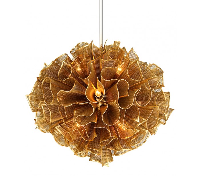 Pulse lysekrone i et smukt udført design, fremstillet i guldfarvet jern. Lysekronen måler 78 cm i diameter og anvender 12 x E14 lyskilder.