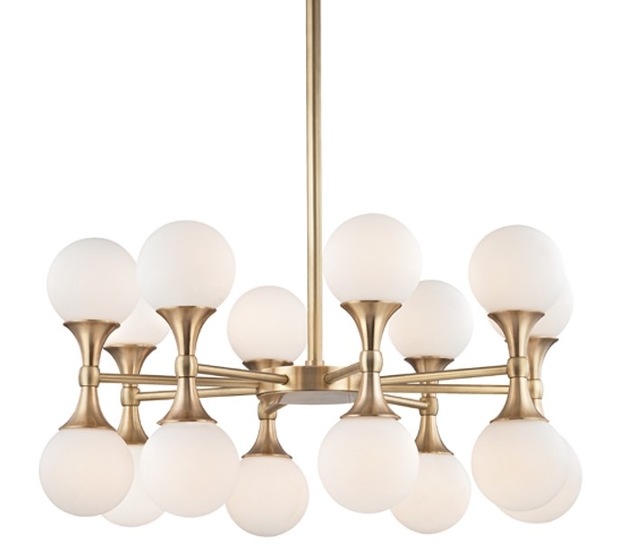 Astoria lysekrone i et design, fremstillet i antik messing og med skærme i opalhvid glas. Lysekronen måler 69 cm i diameter og anvender 16 x G9 LED lyskilder.