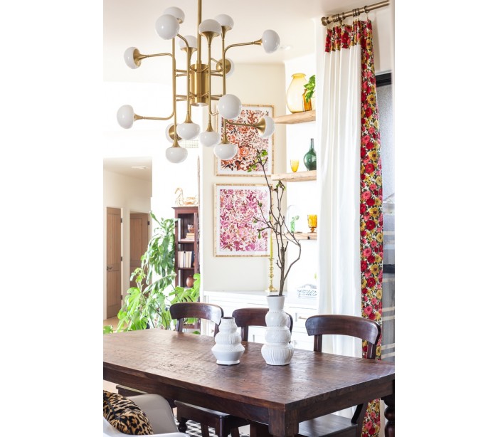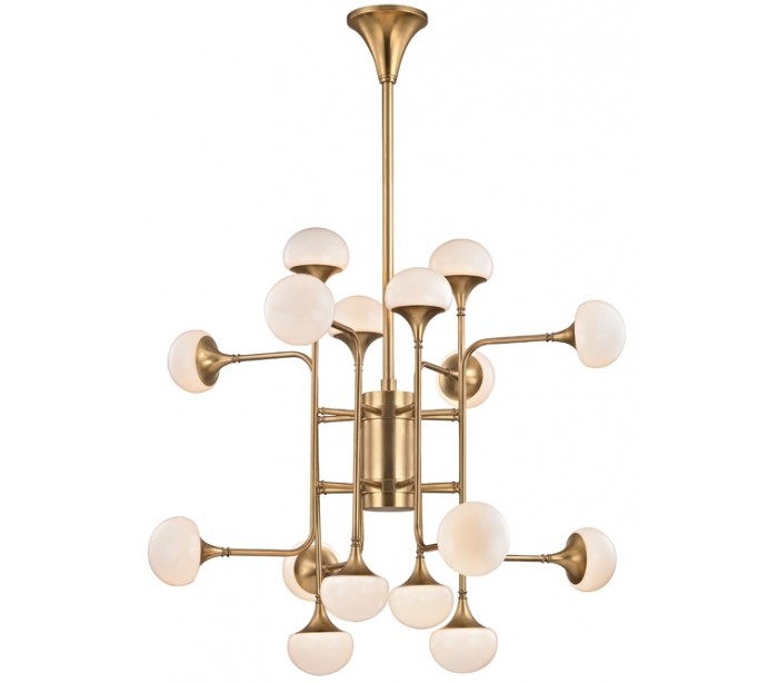 Fleming lysekrone i et design, fremstillet i antik messinglakeret stål og med skærme i opalhvid glas. Lysekronen måler 92 cm i diameter og anvender 16 x G9 LED lyskilder.