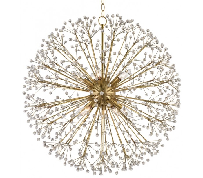 Dunkirk lysekrone i et design, fremstillet i antik messinglakeret stål og klart krystalglas. Lysekronen måler 76 cm i diameter og anvender 10 x E14 lyskilder.