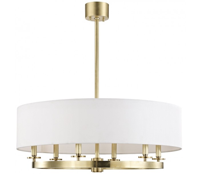 Durham lysekrone i et design, fremstillet i antik messinglakeret stål og med skærm i offwhite linned. Lysekronen måler 78 cm i diameter og anvender 6 x E14 lyskilder.