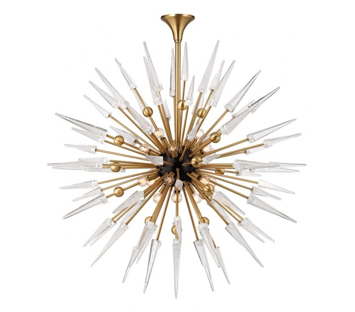 Sparta lysekrone i et design, fremstillet i antik messing og klart glas. Lysekronen måler 122 cm i diameter og anvender 18 x E14 lyskilder.
