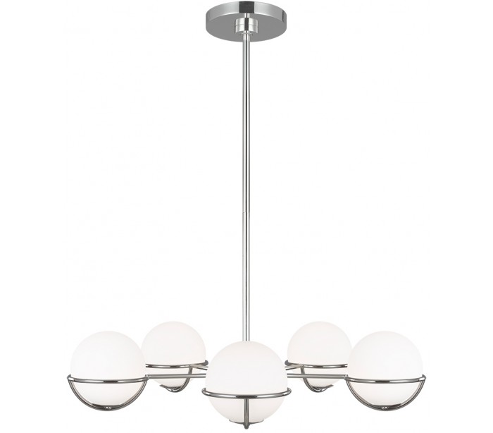 Apollo 5 lysekrone i et moderne design, fremstillet i poleret nikkellakeret stål og med skærme i hvid opalglas. Lampen måler 81,3 cm i diameter og anvender 5 x G9 LED lyskilder (Inkl.).
