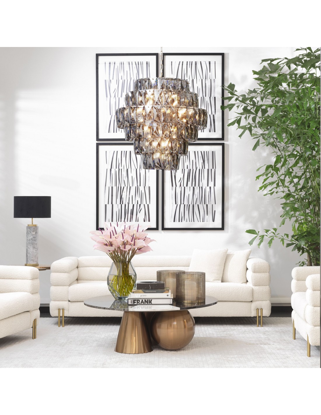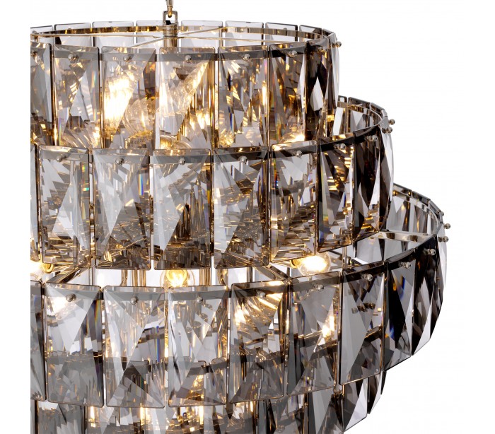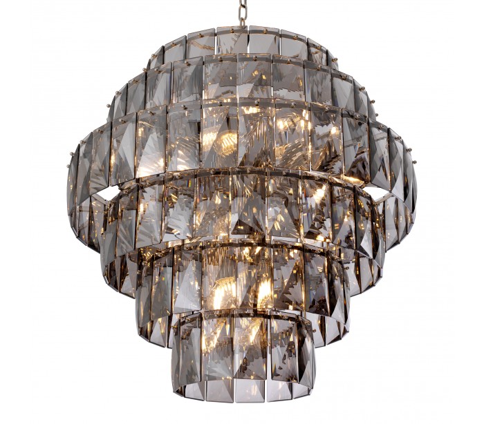 Eichholtz Amazone L lysekrone udført i et moderne design af røget glas. Lysekronen måler 80 cm i højden og 80 cm i diameter og anvender 26 x E14 lyskilder.