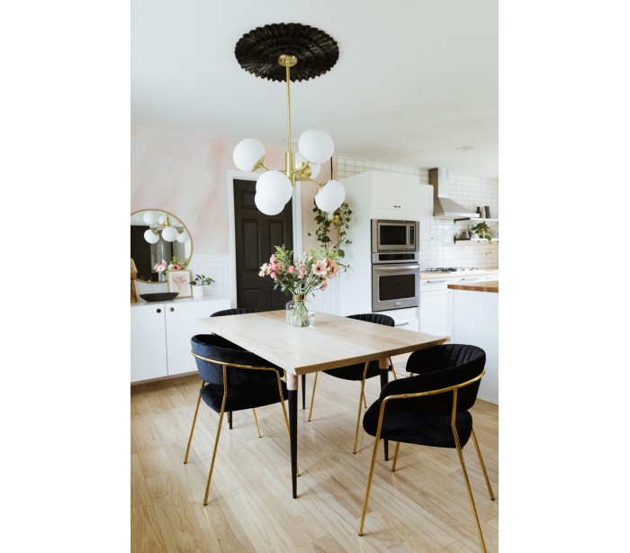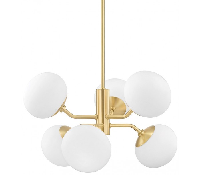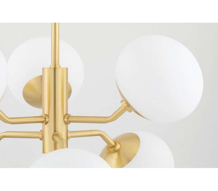 Estee lysekrone i et moderne design, fremstillet i antik messinglakeret stål og med skærme i hvid opalglas. Lysekronen måler 71 cm i diameter og anvender 6 x E27 lyskilder.
