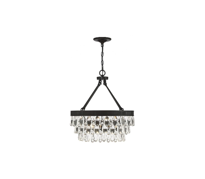 Windham 4 lysekrone udført i et design af antik bronzelakeret stål og med skærm i klart krystalglas. Lampen er fra amerikanske Savoy House og anvender 4 x E14 lyskilder og måler 51 cm i diameter og 56 cm i højden.