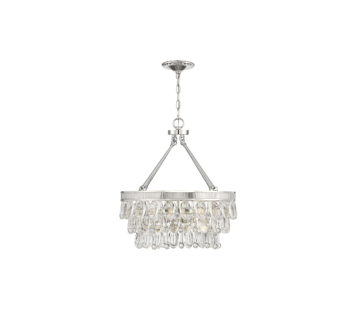 Windham 4 lysekrone udført i et design af poleret nikkel lakeret stål og med skærm i klart krystalglas. Lampen er fra amerikanske Savoy House og anvender 4 x E14 lyskilder og måler 51 cm i diameter og 56 cm i højden.