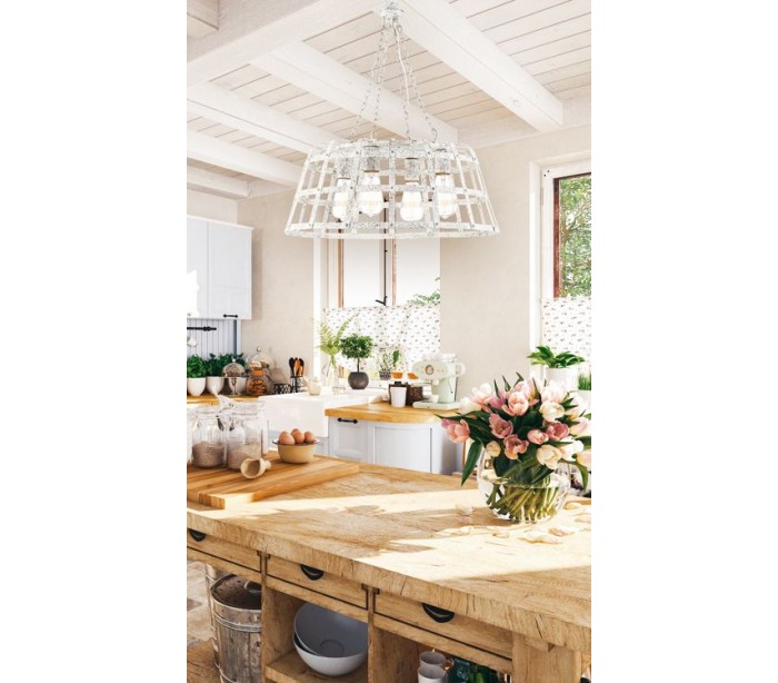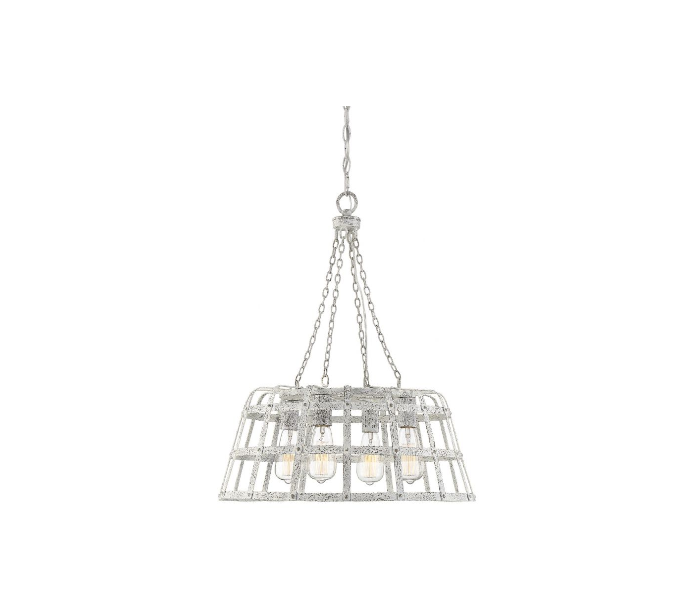 Westbrook 4 lysekrone udført i et design af antik gråhvid lakeret stål. Lampen er fra amerikanske Savoy House og anvender 4 x E27 lyskilder og måler 56 cm i diameter og 66 - 360 cm i højden.