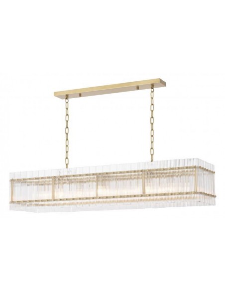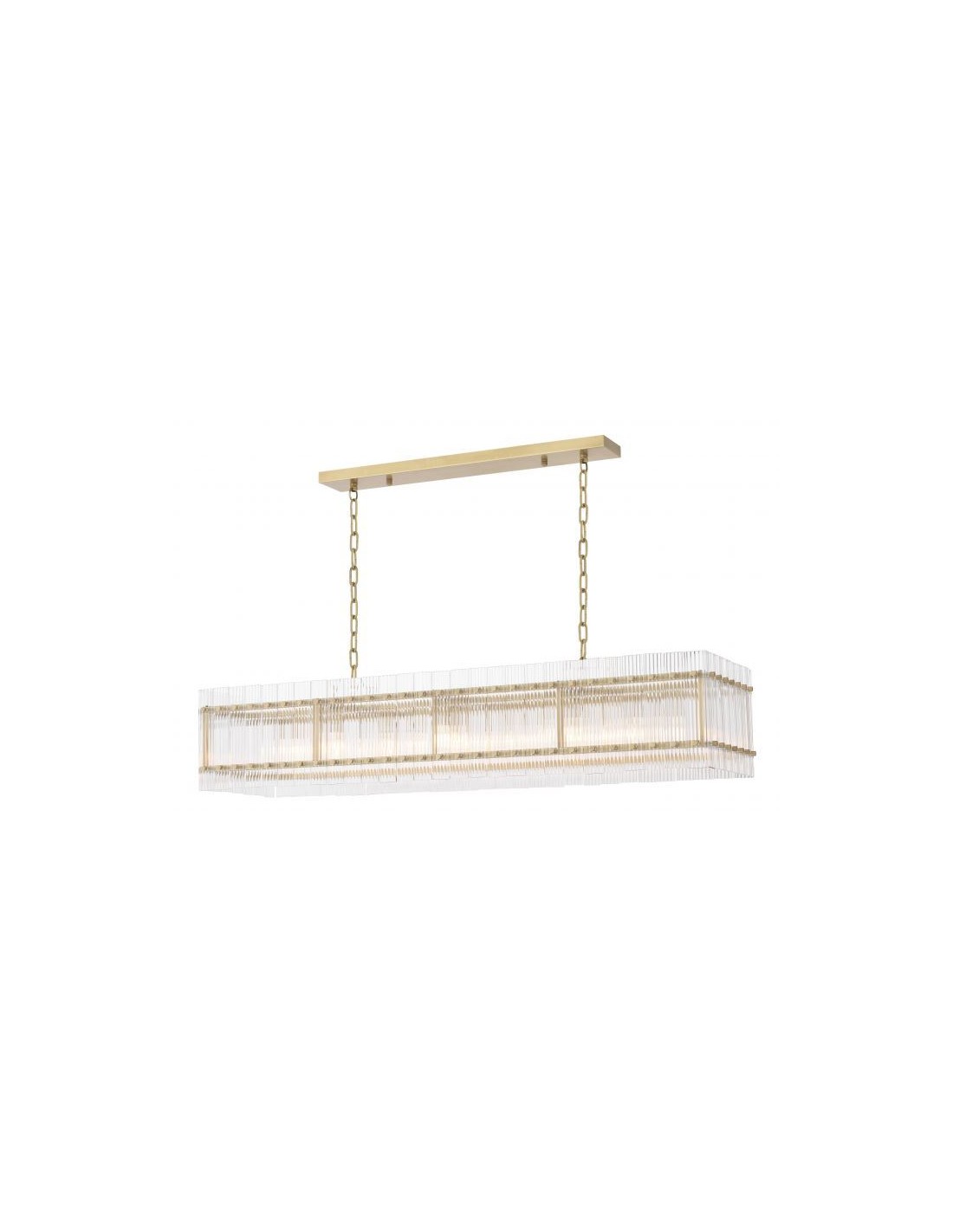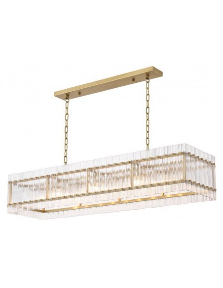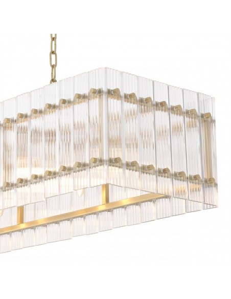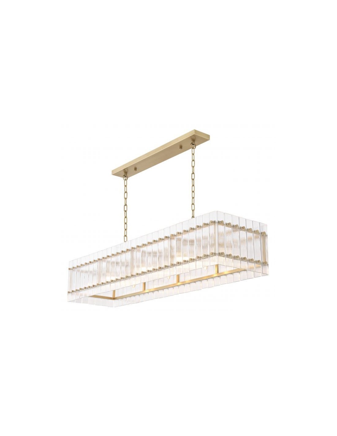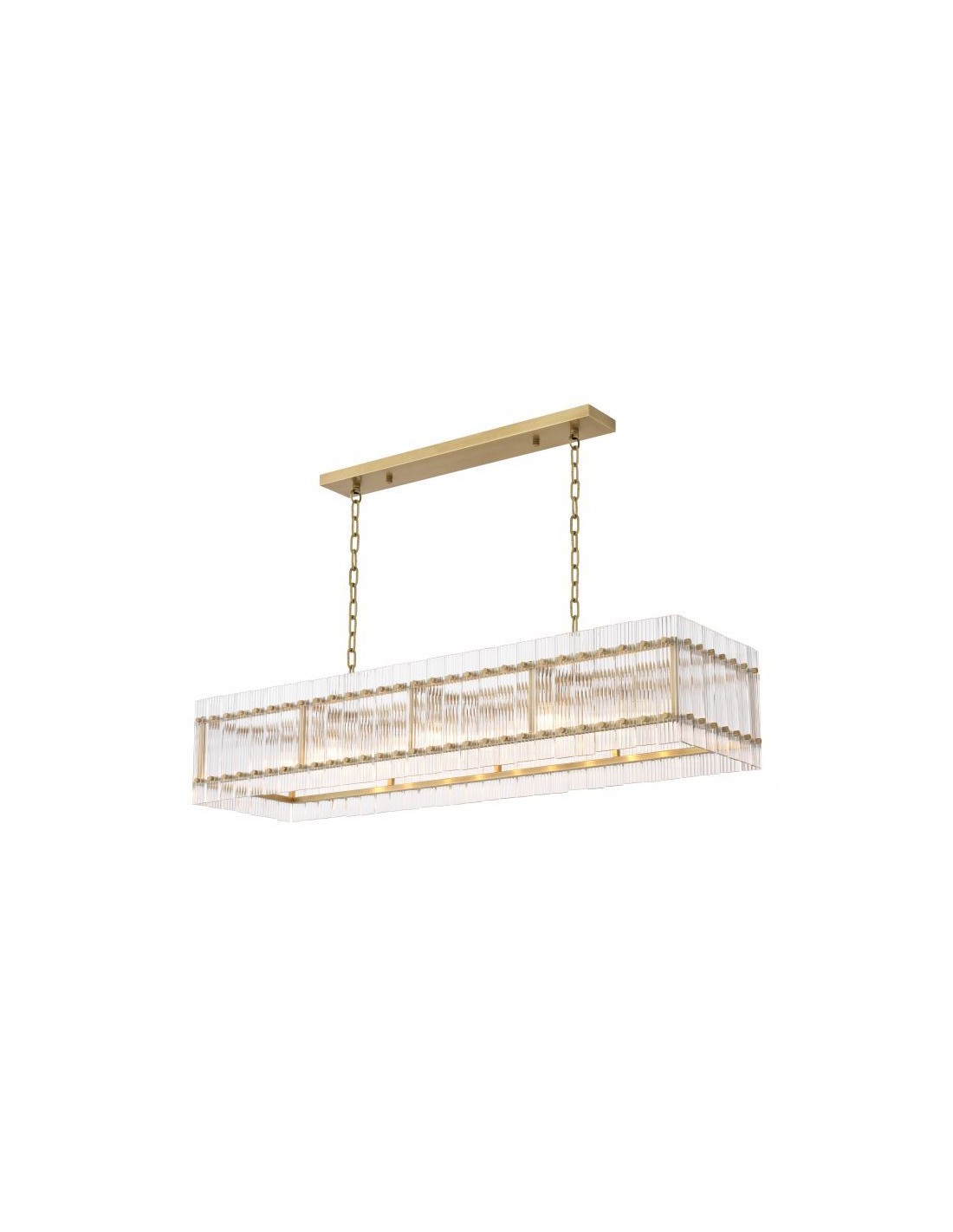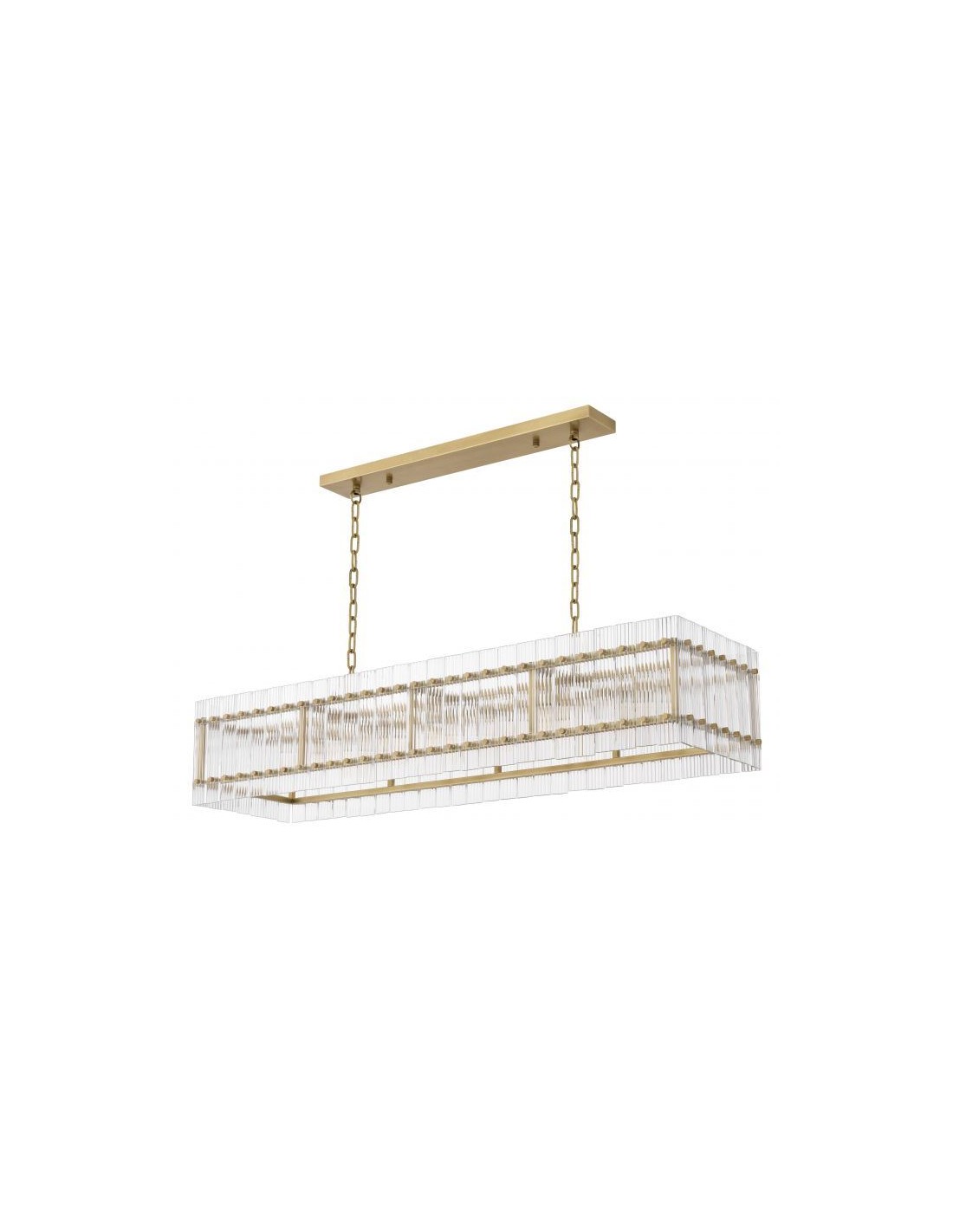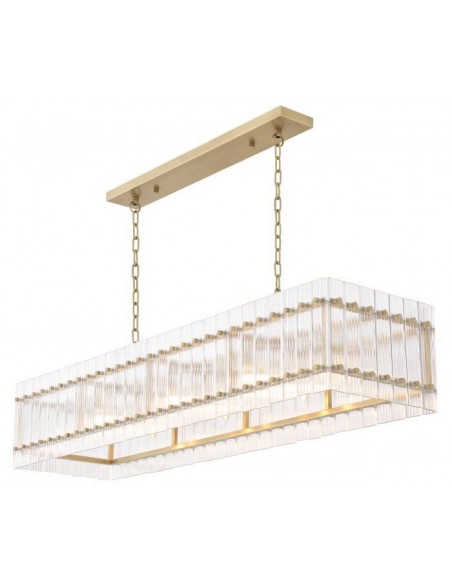 Eichholtz Ruby lysekrone udført i et flot design af antik bronzelakeret stål og riflet glas. Lysekronen måler 140,5 x 39 cm i bredde og dybde og 27 - 177 cm i højden og anvender 10 x E14 lyskilder.