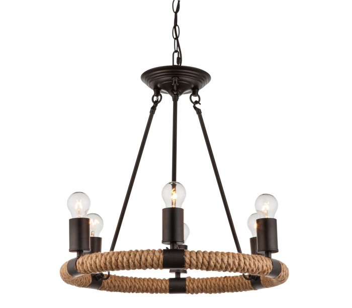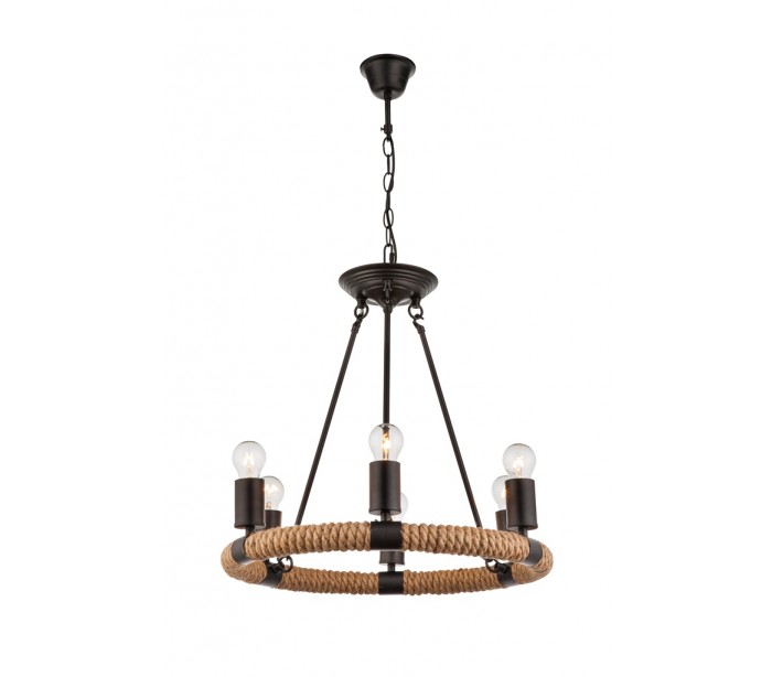 Anderledes og spændende lysekrone, udført i et design af rustik metal og reb. Lysekronen måler 49,5 cm i diameter og kommer med 6 fatninger (lyskilde ikke inkl.). Lampen kan med fordel benyttes sammen med de moderne Edison glødepærer, eller LED lyskilder, dog max. 40W pr. lyskilde.