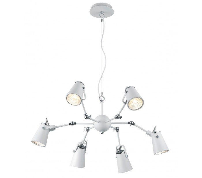 Moderne lysekrone udført i et design med justerbare arme med højde på op til 150 cm og diameter op til 80 cm. Lampen benytter 6 x E14, max. 28W hver (Ekskl.). Kan med fordel benyttes sammen med LED lyskilder.