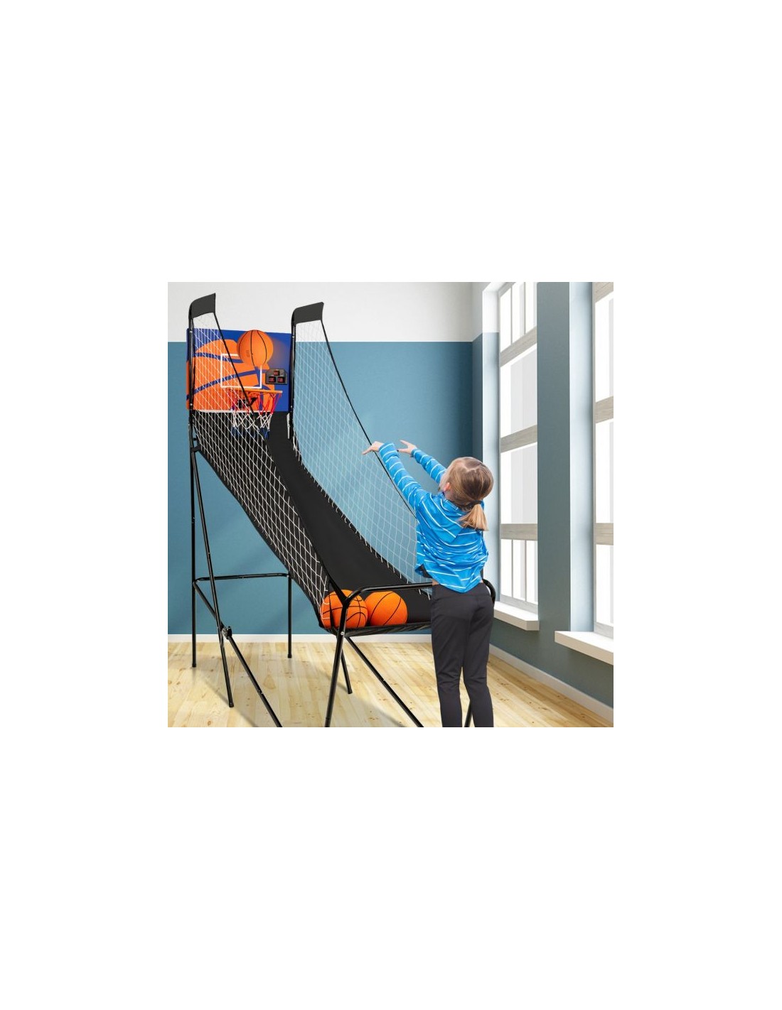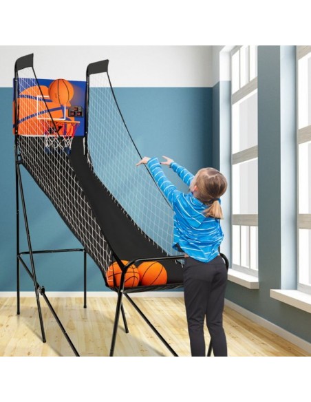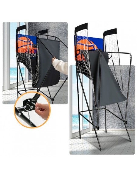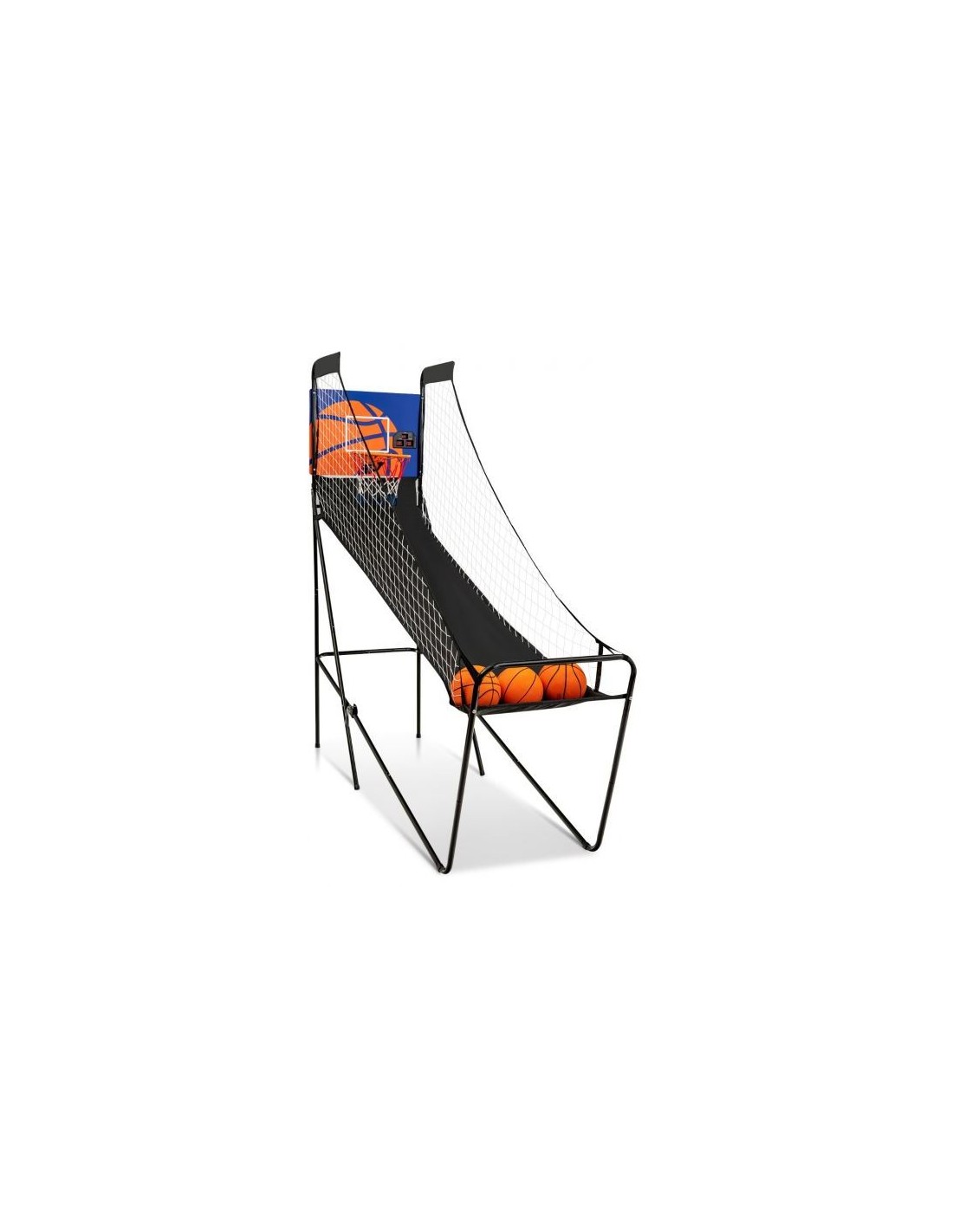 Transportabelt basketball spil, udført i et design af sortlakeret metal og polyester og nylon. Målet måler 207 cm i højden og 208 cm i bredden.