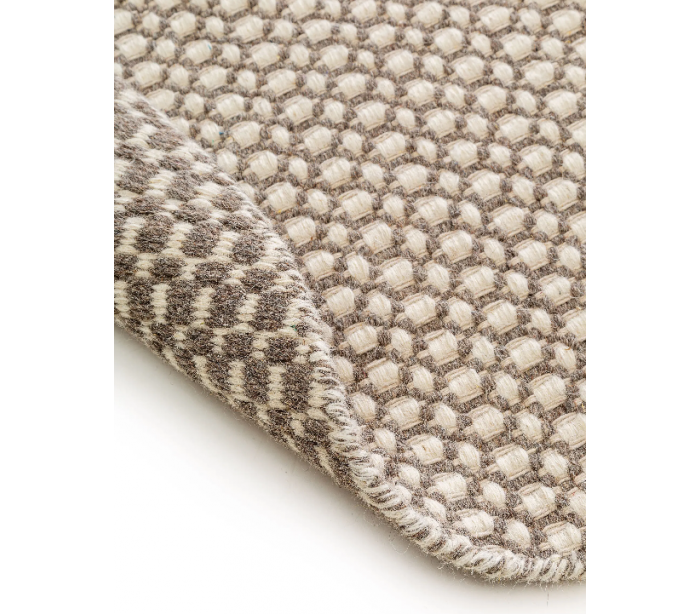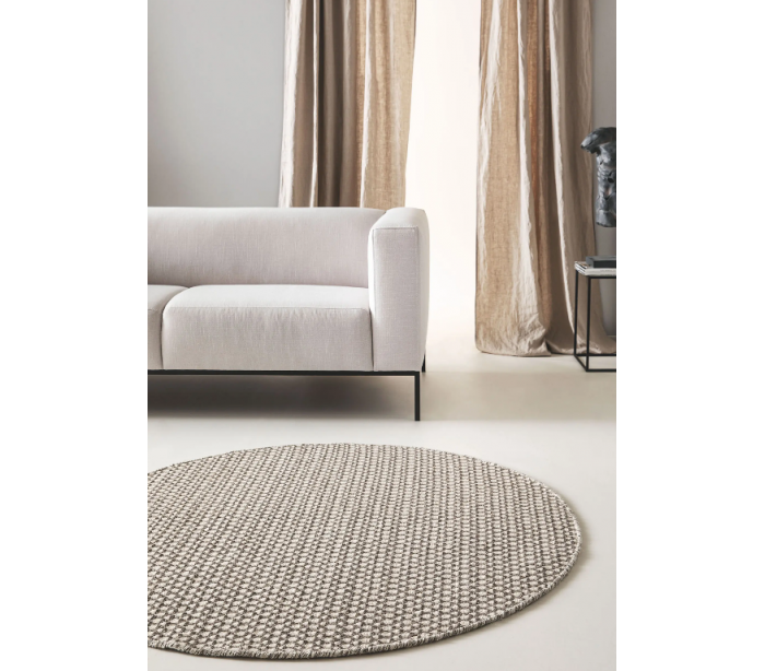 Dekorativt løst tæppe til entre, soveværelse eller stue, udført i et design af 80% uld og 20% bomuld. Tæppet måler 150 cm i diameter.