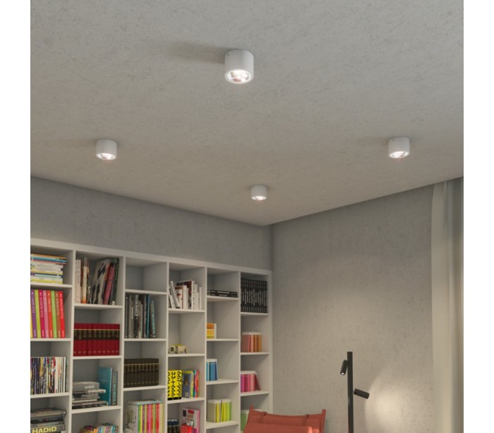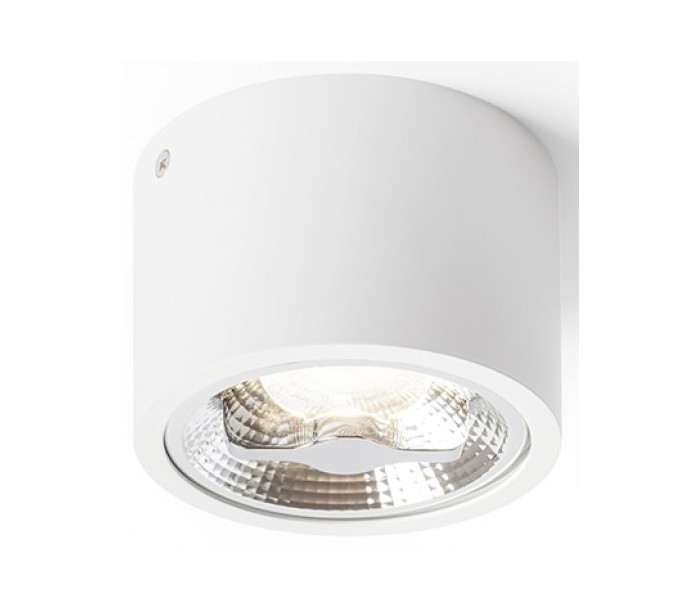 Påbygningsspot i et design fremstillet af hvidlakeret aluminium. Lampen har indbygget 1 x LED lyskilde på 15W, med retningsbestemt belysning. Spotten er dæmpbar med ekstern lysdæmperkontakt.