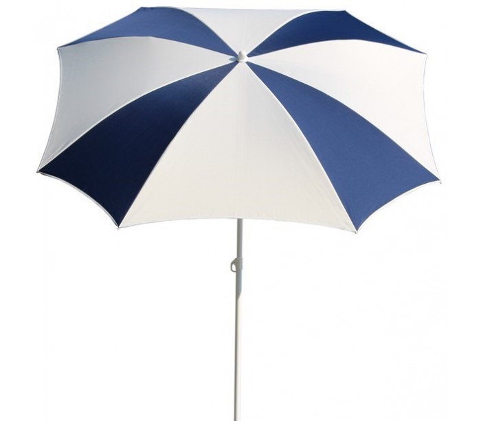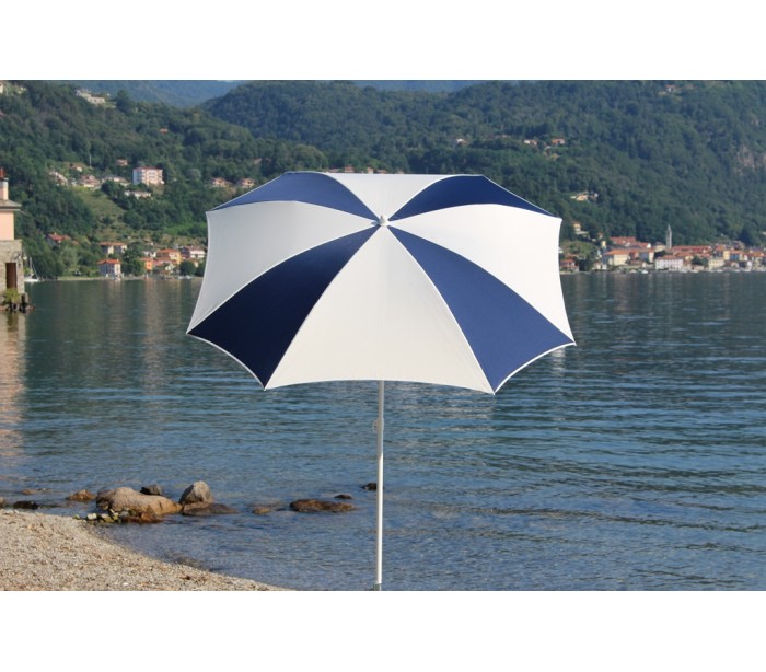 Maffei Malta parasol fremstillet i et design af hvid og blå UV-beskyttet (50+) og vandtæt polyester og med stang i hvidlakeret stål. Parasollen måler 200 cm i diameter og med en højde på 215 cm.
