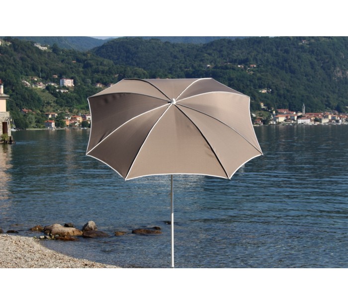 Maffei Malta parasol fremstillet i et design af taupe farvet UV-beskyttet (50+) og vandtæt polyester og med stang i hvidlakeret stål. Parasollen måler 200 cm i diameter og med en højde på 215 cm.