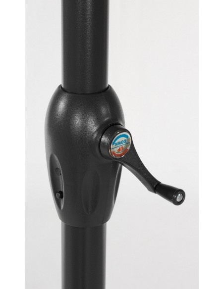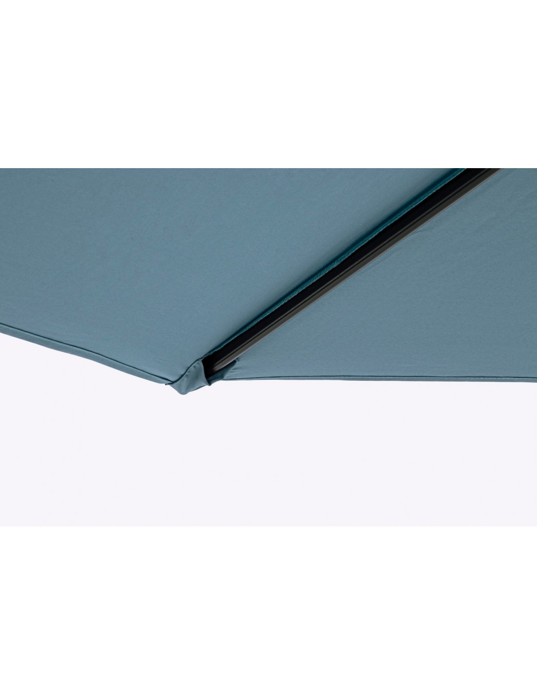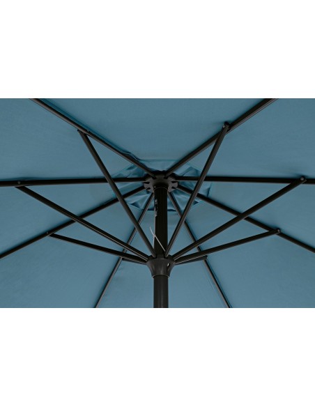 Parasol udført i et moderne design af himmelblå polyester og stang i sortlakeret aluminium. Parasollen er med luftkanal i toppen, og med håndsving for op og nedtagning. Parasollen er med UV beskyttelse, der hæmmer at den falmer i solens stråler.